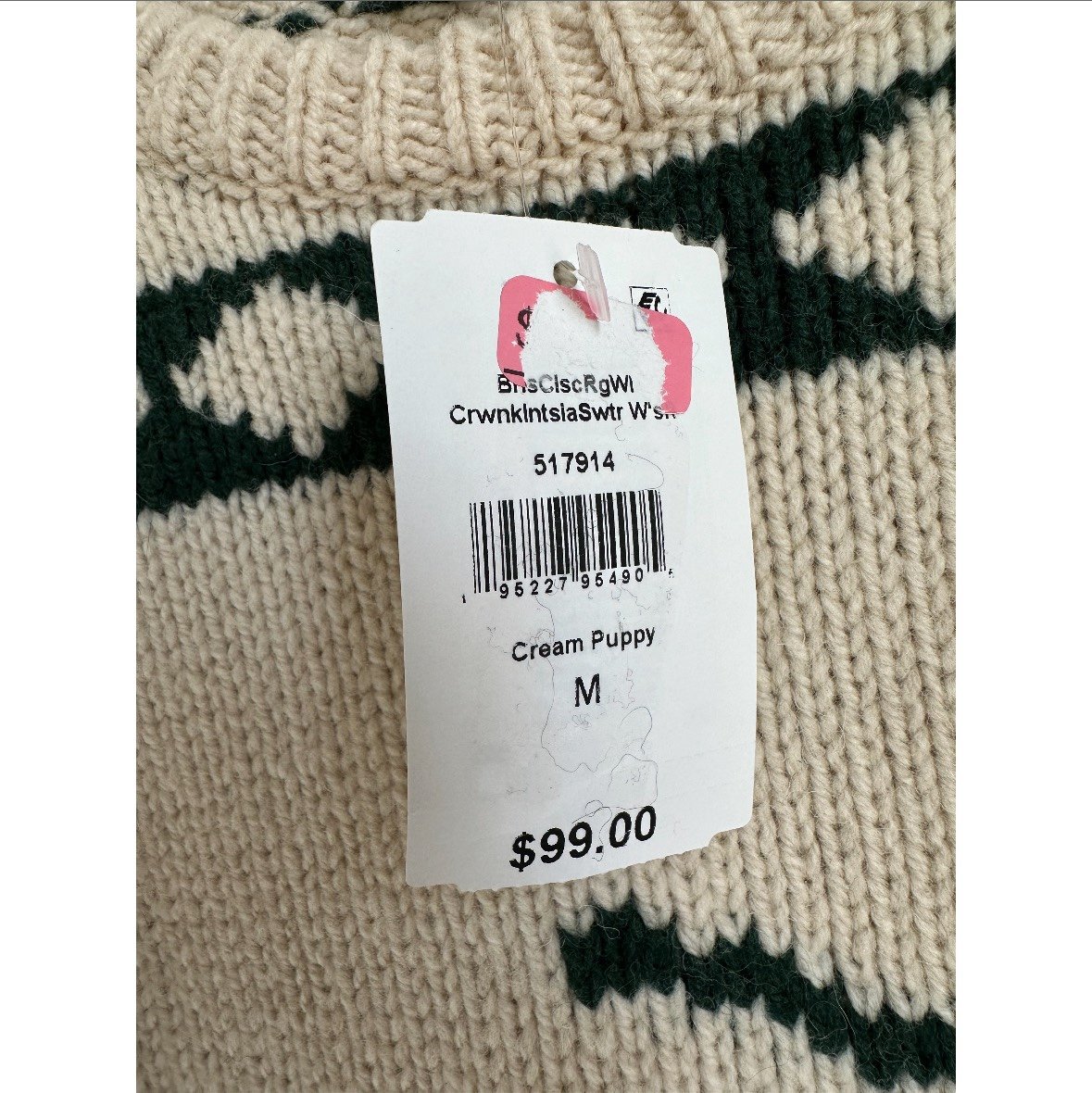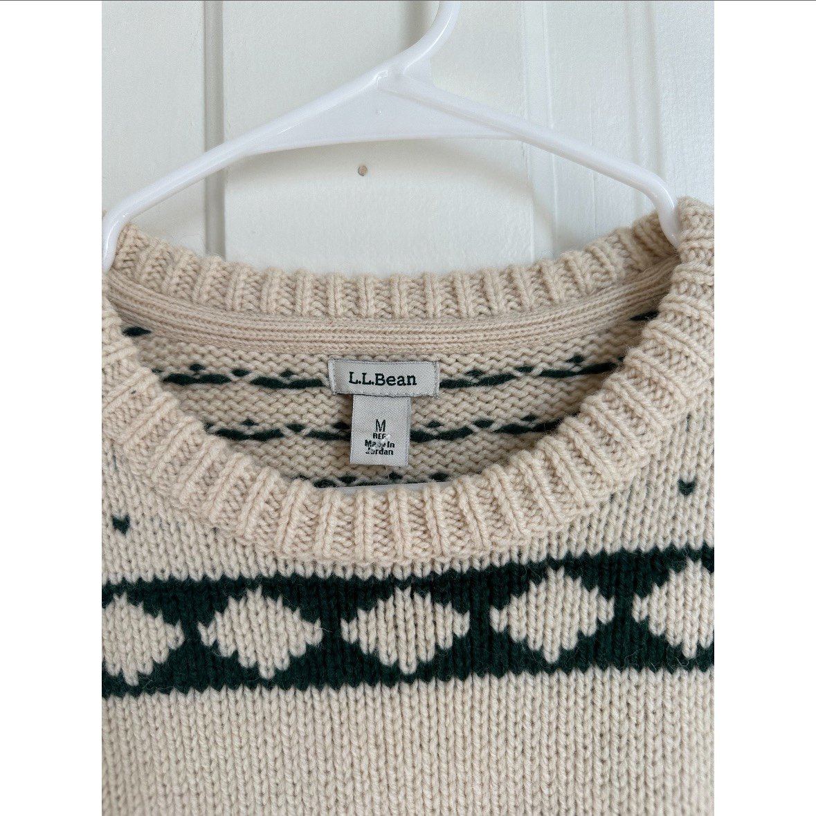 This L.L. Bean sweater is a timeless classic that will never go out of style. Made from high-quality 100% lambs wool, it is sure to keep you warm and cozy during the colder months. The cream color and puppy and boot design make it a perfect addition to any woman's wardrobe. The sweater features a crew neck and pullover style, making it easy to wear and comfortable. Size medium regular.